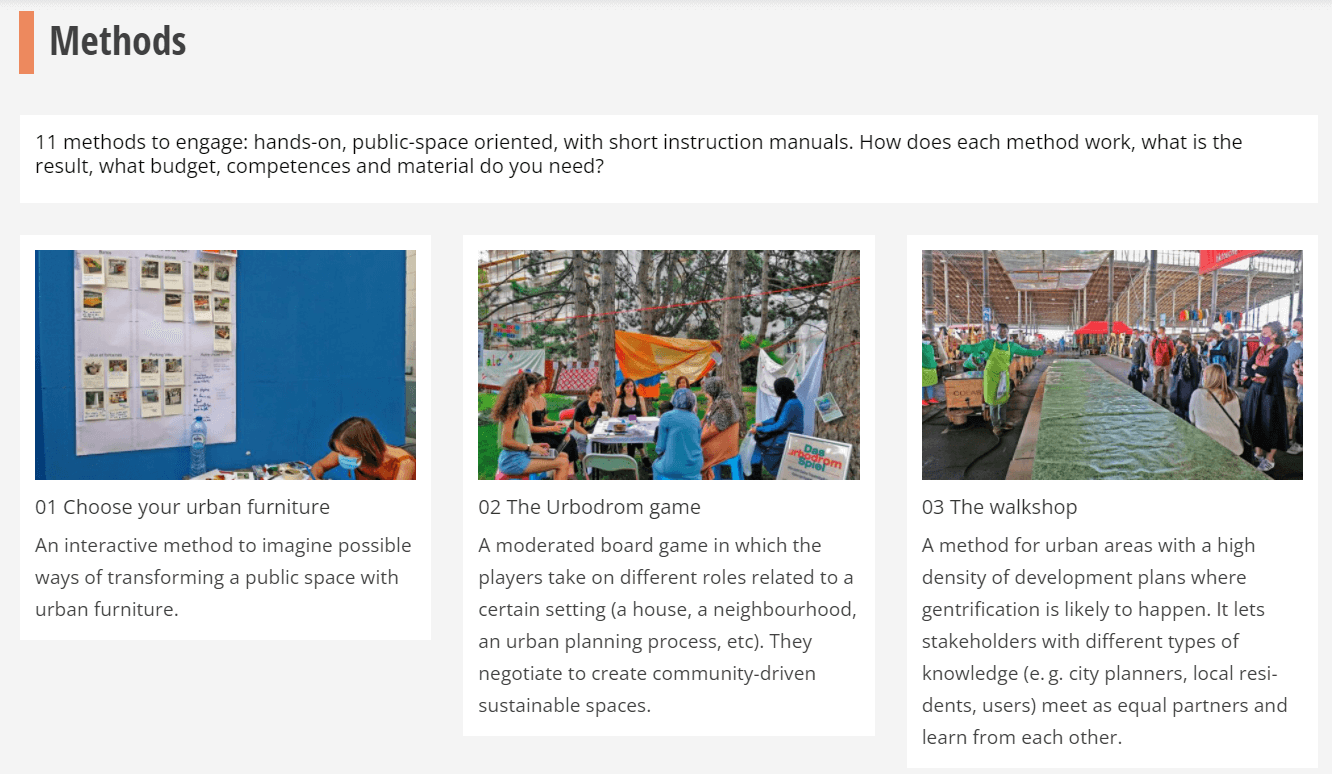 Die Herausforderung bestand darin, eine gedruckte Toolbox für Stadtentwicklungsprozesse in ein Webseiten-Format zu bringen. Die komplexen Inhalte wurden dementsprechend vereinfacht. Das Ergebnis war eine Webseite, die man „durchblättern“ konnte und die eine gewisse inhaltliche Tiefe bot, ohne eine komplizierte Navigation zu erfordern.